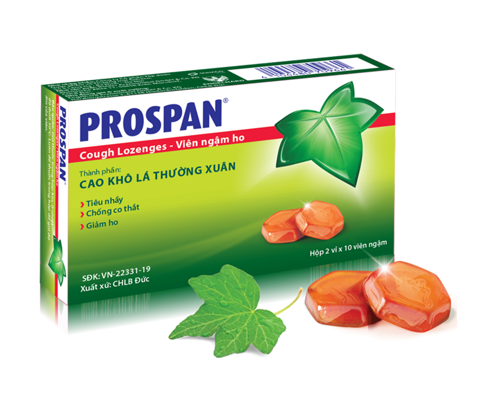 Viên Ngậm Ho Prospan là thuốc ho thảo dược nhập khẩu từ Đức với chiết xuất từ cao khô lá Thường Xuân – một loại thảo dược có tác dụng giảm ho, làm giãn cơ trơn phế quản, hỗ trợ thông thoáng đường hô hấp, làm dịu niêm mạc họng, giảm đau, long đờm, thông mũi và làm dịu cơn ho nhanh chóng. Viên ngậm ho Prospan dạng viên mềm, không gây sạn rát lưỡi và có thể đặt sâu trong cổ họng.