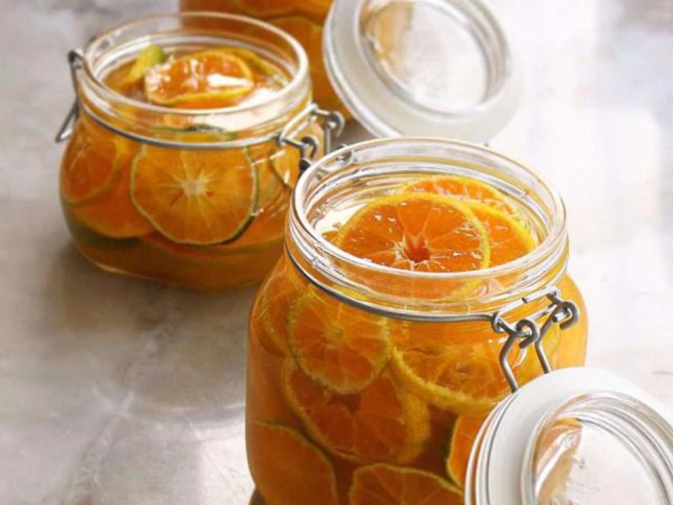 - Thực hiện: Chanh đào rửa sạch rồi ngâm trong nước đun sôi cùng muối trong khoảng 30 phút. Sau đó vớt chanh ra, để ráo và cắt thành từng lát mỏng vừa phải. Đường phèn giã nhuyễn rồi cho vào bình thủy tinh cùng chanh đào, 1 lớp chanh, 1 lớp đường cho đến hết. Khi đã xếp xong chanh, sau cùng rót mật ong vào cho đến khi đầy bình là được. Ngâm chanh đào trong khoảng 3 tháng là có thể sử dụng được.
