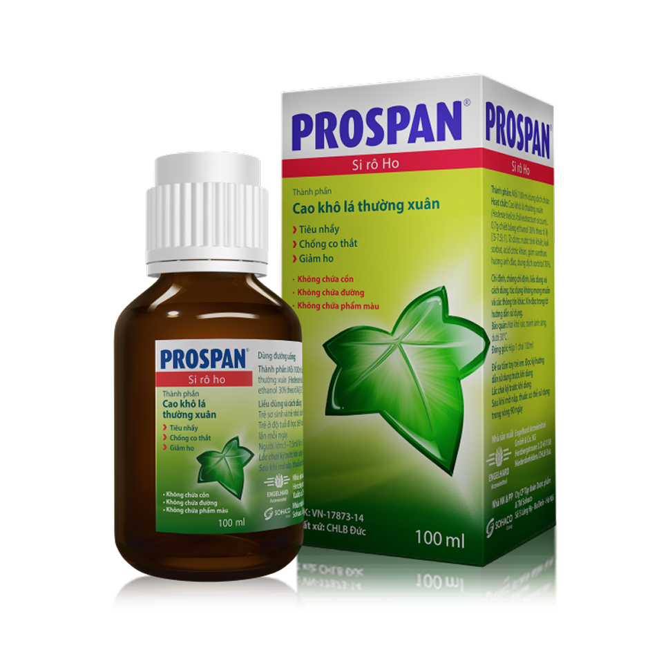 Siro ho Prospan được nhập khẩu từ CHLB Đức, được phân phối tại 105 quốc gia và là thuốc ho có thị phần bán chạy số 1 tại Đức. Với thành phần từ cao khô lá thường xuân, siro Prospan tăng khả năng trị ho, long đờm hiệu quả nhờ 3 cơ chế tác động: Tiêu nhầy (long đờm) – Chống co thắt – Giảm ho.