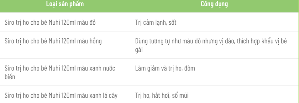 Siro ho Muhi chuyên trị ho cho trẻ em có 4 loại sản phẩm với công dụng khác nhau.