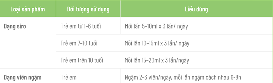 - Trẻ em trên 3 tuổi: 10ml/lần x 3 lần/ngày.