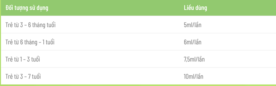 - Trẻ từ 3 – 6 tháng: 5ml/lần, 3 lần/ngày