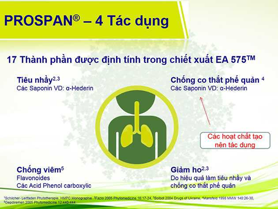 Thuốc ho Prospan với thành phần chính là dịch chiết EA575™ từ lá thường xuân có tác dụng long đờm, giãn phế quản, kháng viêm và giảm ho nhanh chóng.
