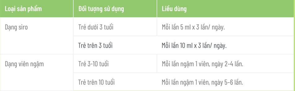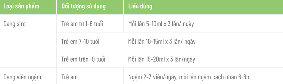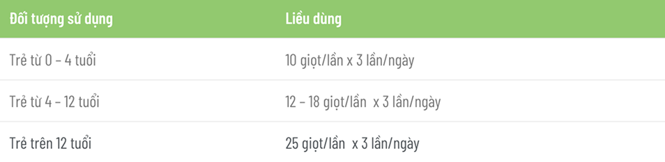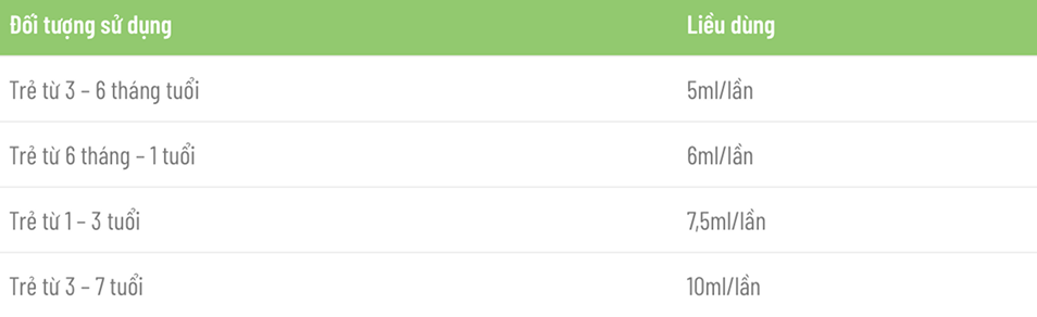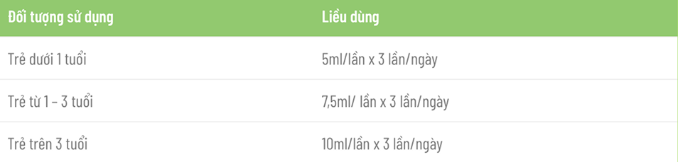 - Đối tượng sử dụng và liều dùng: Nên cho bé uống mỗi ngày 3 lần, sau bữa ăn, mỗi lần cách nhau 4 tiếng.
