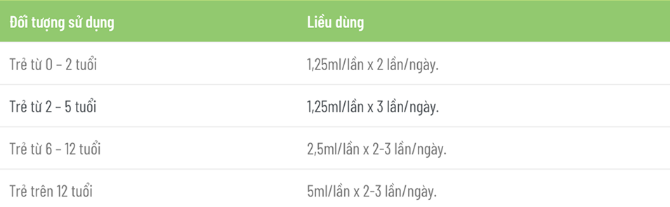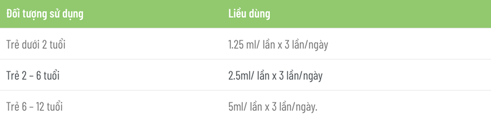 - Trẻ dưới 2 tuổi 1.25 ml/ lần x 3 lần/ngày