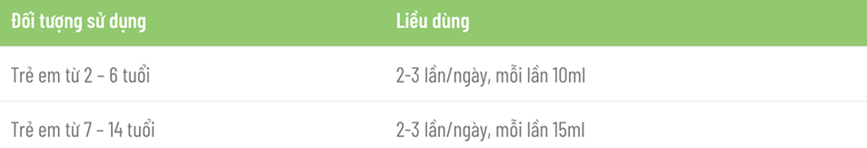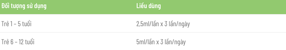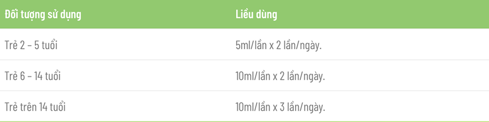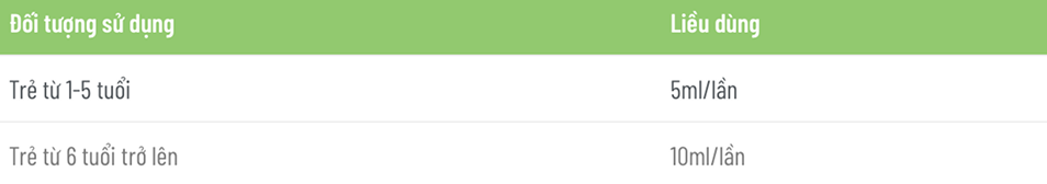 - Trẻ 6 – 12 tuổi 5ml/ lần x 3 lần/ngày.