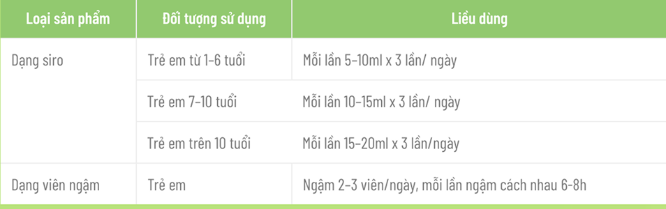 - Trẻ em từ 2 – 6 tuổi: Mỗi lần 10ml x 2-3 lần/ ngày