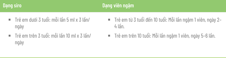 - Trẻ em trên 3 tuổi: Mỗi lần 10ml x 3 lần/ngày.