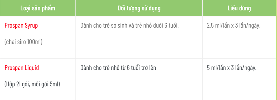 - Loại sản phẩm: Prospan dành cho trẻ có 2 loại sản phẩm với liều dùng tương ứng như sau: