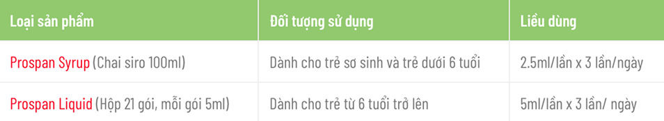 • Phân loại thuốc ho trẻ em của Đức Prospan: Prospan có hai loại sản phẩm dành cho trẻ em với liều dùng tương ứng trong bảng dưới đây: