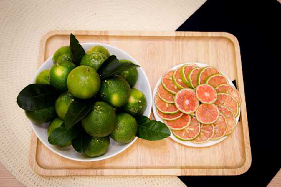 - Chanh đào: Sở dĩ, chanh được sử dụng để trị ho, long đờm là do nó chứa hàm lượng lớn tinh dầu, vitamin A, vitamin C, vitamin B1, B2,… Mẹ chuẩn bị 1 – 2 quả chanh đào, thái lát mỏng rồi trộn cùng đường phèn. Chưng cách thủy trong khoảng 15 – 20 phút. Để nguội bớt rồi cho trẻ uống từng thìa. Lưu ý, mẹ nên chọn những quả vỏ mỏng, màu vàng hanh, tươi và không chọn quả quá to.